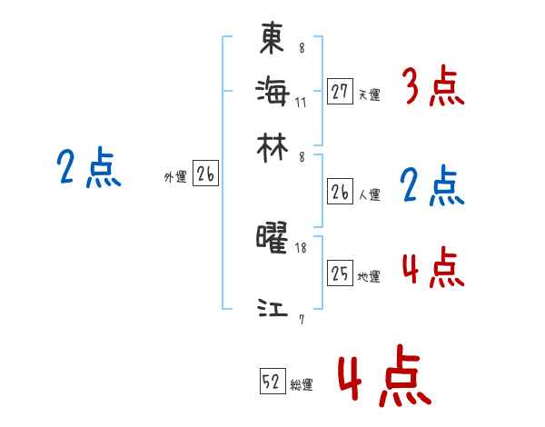外運![]() | 東海林曜江さんの外運は26画の2つ星!波瀾万丈かも。信頼できる人を大事にしましょう。 生活面を象徴する運勢です。外部から受ける影響力を表し、結婚運、家庭運や職場、環境への順応性を表します。 |