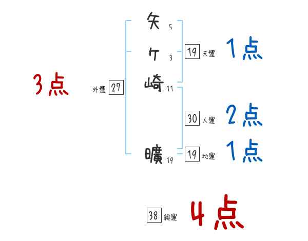外運![]() | 矢ヶ崎曠さんの外運は27画の3つ星!頭脳明晰だが強情で摩擦が多い傾向。孤立に注意。 生活面を象徴する運勢です。外部から受ける影響力を表し、結婚運、家庭運や職場、環境への順応性を表します。 |