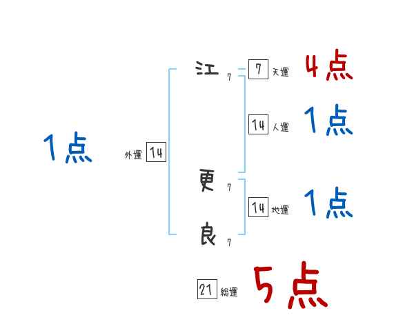 外運![]() | 江更良さんの外運は14画の1つ星!人に対して優しいがストレスを溜め込みがち。人間関係のトラブルを避けるよう気をつけましょう。 生活面を象徴する運勢です。外部から受ける影響力を表し、結婚運、家庭運や職場、環境への順応性を表します。 |