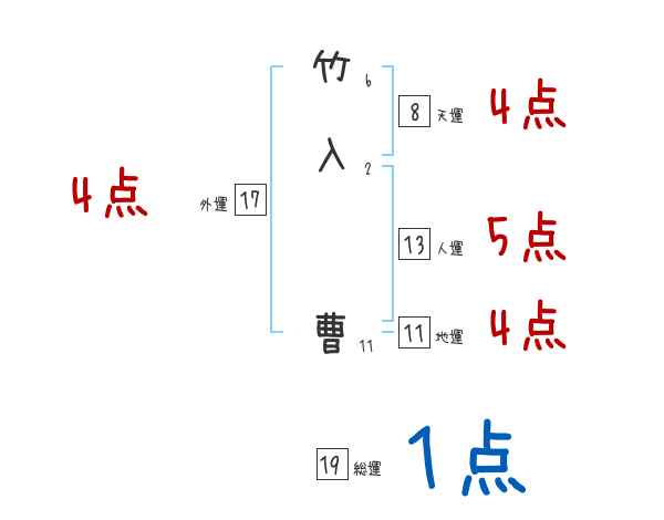 天運![]() | 竹入曹さんの天運は8画の4つ星!勤勉家。根気強く努力し成功する。忍耐力がある。 家系が持つ宿命的な運勢を表します。祖先から受け継いだ苗字ですので自分の力が及びません。家柄を象徴します。 |