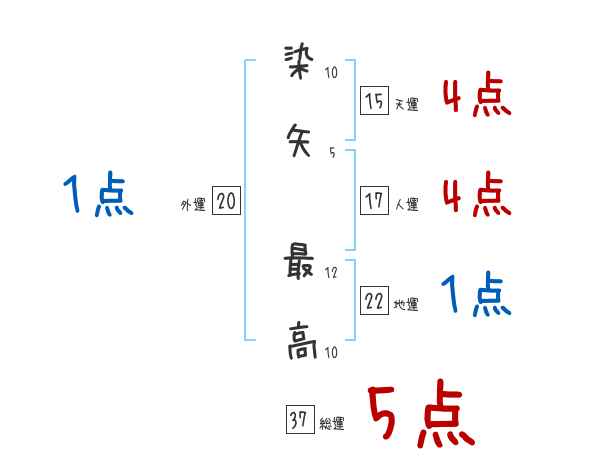地運![]() | 染矢最高さんの地運は22画の1つ星!努力することが苦手ないっぽう手先が器用。芸術性にも優れる。 個性を表す基礎的な運勢です。性格形成や対人関係、行動力など家庭環境に影響されます。主に誕生してから20歳くらいまでの若年期の運勢を表します。 |