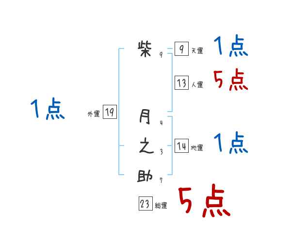 天運![]() | 柴月之助さんの天運は9画の1つ星!消極的で才能を発揮することが苦手なことも。周りの意見に耳を傾けましょう。 家系が持つ宿命的な運勢を表します。祖先から受け継いだ苗字ですので自分の力が及びません。家柄を象徴します。 |