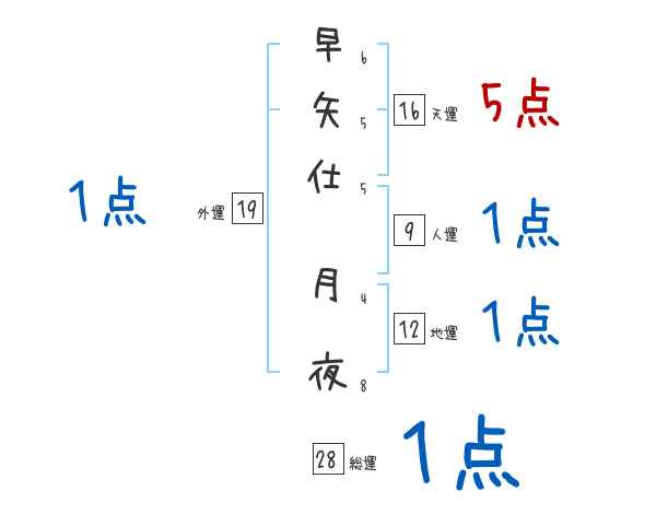 天運![]() | 早矢仕月夜さんの天運は16画の5つ星!人望が厚く大きく発展する。逆転成功が見える。 家系が持つ宿命的な運勢を表します。祖先から受け継いだ苗字ですので自分の力が及びません。家柄を象徴します。 |