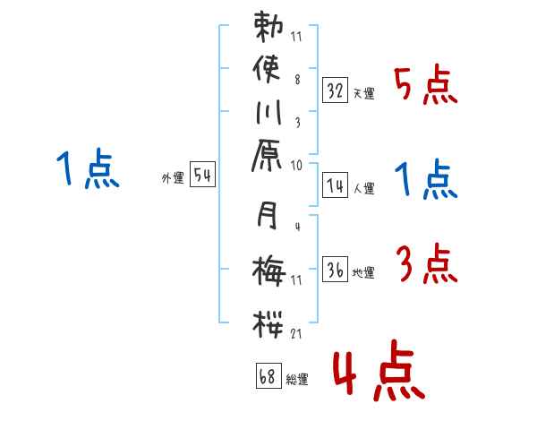 天運![]() | 勅使川原月梅桜さんの天運は32画の5つ星!柔軟性があり成功する。チャンスが多く金運が良い。 家系が持つ宿命的な運勢を表します。祖先から受け継いだ苗字ですので自分の力が及びません。家柄を象徴します。 |