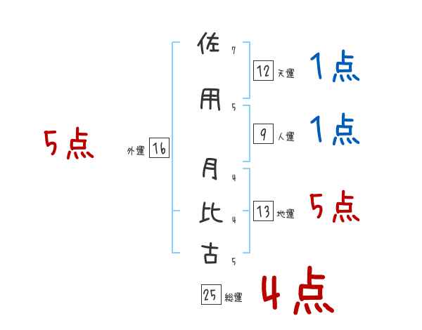 外運![]() | 佐用月比古さんの外運は16画の5つ星!人望が厚く大きく発展する。逆転成功が見える。 生活面を象徴する運勢です。外部から受ける影響力を表し、結婚運、家庭運や職場、環境への順応性を表します。 |