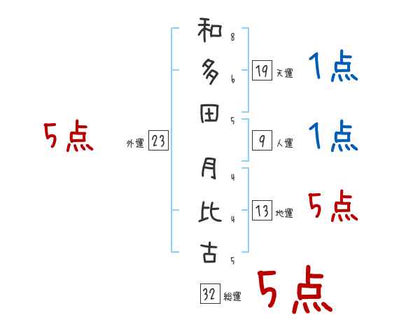 総運![]() | 和多田月比古さんの総運は32画の5つ星!柔軟性があり成功する。チャンスが多く金運が良い。 あなたの人生を表す1番重要な運勢です。生涯を通じて影響する総合運となり、主に50歳以降の晩年期に影響を及ぼします。 |