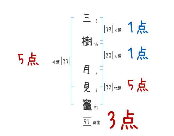 天運![]() | 三樹月見竈さんの天運は19画の1つ星!優れた才能を持ちますが、協調性が足りないことも。周りの人と協力する事を意識しましょう。 家系が持つ宿命的な運勢を表します。祖先から受け継いだ苗字ですので自分の力が及びません。家柄を象徴します。 |