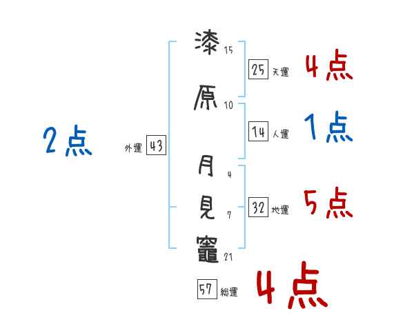 天運![]() | 漆原月見竈さんの天運は25画の4つ星!個性があり才能があふれる。強運の持ち主で発展する。 家系が持つ宿命的な運勢を表します。祖先から受け継いだ苗字ですので自分の力が及びません。家柄を象徴します。 |