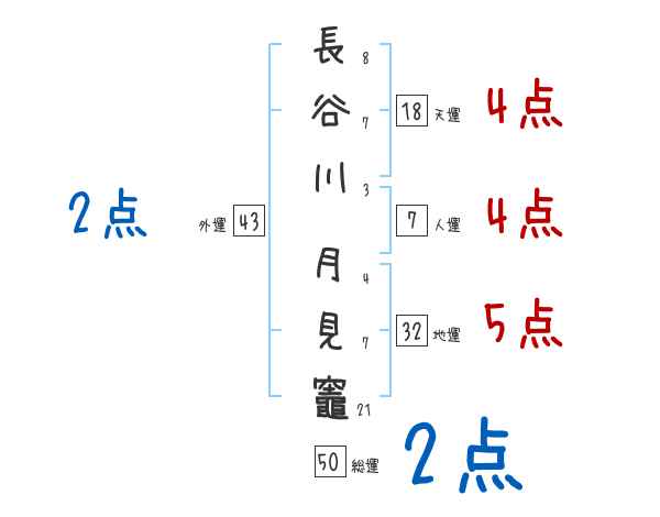 地運![]() | 長谷川月見竈さんの地運は32画の5つ星!柔軟性があり成功する。チャンスが多く金運が良い。 個性を表す基礎的な運勢です。性格形成や対人関係、行動力など家庭環境に影響されます。主に誕生してから20歳くらいまでの若年期の運勢を表します。 |