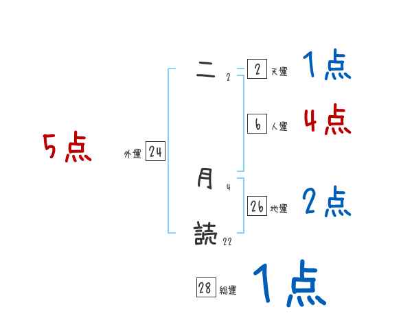 外運![]() | 二月読さんの外運は24画の5つ星!家庭運が良く順調な人生。金運にも恵まれる。 生活面を象徴する運勢です。外部から受ける影響力を表し、結婚運、家庭運や職場、環境への順応性を表します。 |