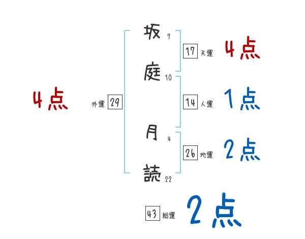 総運![]() | 坂庭月読さんの総運は43画の2つ星!頑固な性格で独立心が強いかも。やや非現実的で浪費に注意しましょう。 あなたの人生を表す1番重要な運勢です。生涯を通じて影響する総合運となり、主に50歳以降の晩年期に影響を及ぼします。 |