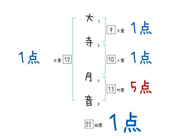 外運![]() | 大寺月音さんの外運は12画の1つ星!簡単な失敗で諦めてしまいやすいかも。着実に行動すると良いでしょう。 生活面を象徴する運勢です。外部から受ける影響力を表し、結婚運、家庭運や職場、環境への順応性を表します。 |