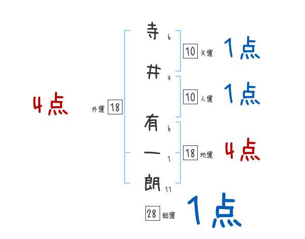 外運![]() | 寺井有一朗さんの外運は18画の4つ星!情熱的で剛気。忍耐力があり信頼される。 生活面を象徴する運勢です。外部から受ける影響力を表し、結婚運、家庭運や職場、環境への順応性を表します。 |