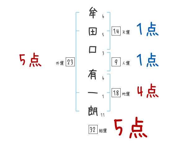 総運![]() | 牟田口有一朗さんの総運は32画の5つ星!柔軟性があり成功する。チャンスが多く金運が良い。 あなたの人生を表す1番重要な運勢です。生涯を通じて影響する総合運となり、主に50歳以降の晩年期に影響を及ぼします。 |