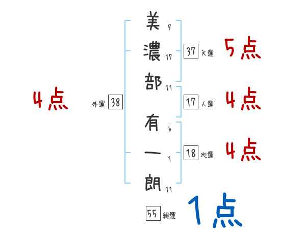 外運![]() | 美濃部有一朗さんの外運は38画の4つ星!温厚な性格で技術的な才能を発揮する。職人的な仕事に向いている。 生活面を象徴する運勢です。外部から受ける影響力を表し、結婚運、家庭運や職場、環境への順応性を表します。 |