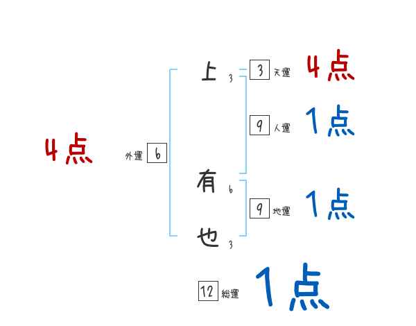 天運![]() | 上有也さんの天運は3画の4つ星!活動的で才能に恵まれ、多くの信頼を得る。希望に満ち成長する。 家系が持つ宿命的な運勢を表します。祖先から受け継いだ苗字ですので自分の力が及びません。家柄を象徴します。 |