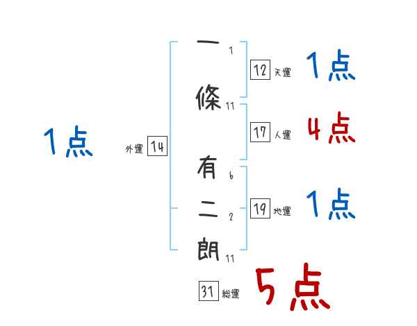天運![]() | 一條有二朗さんの天運は12画の1つ星!簡単な失敗で諦めてしまいやすいかも。着実に行動すると良いでしょう。 家系が持つ宿命的な運勢を表します。祖先から受け継いだ苗字ですので自分の力が及びません。家柄を象徴します。 |