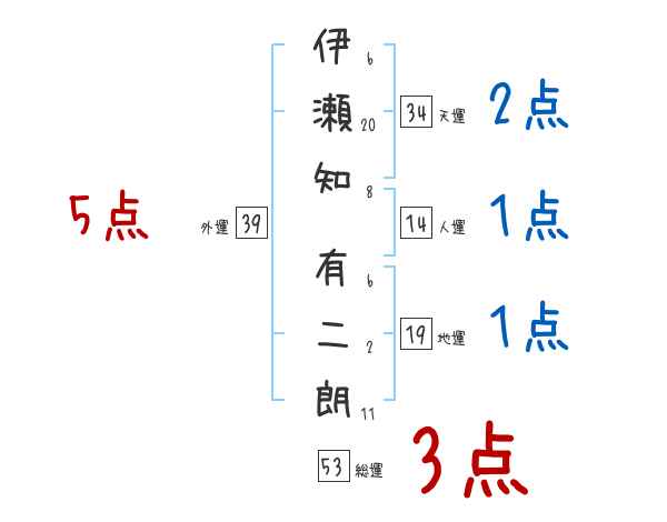 外運![]() | 伊瀬知有二朗さんの外運は39画の5つ星!社交性に優れ人望が厚い。人の上に立ち成功する。 生活面を象徴する運勢です。外部から受ける影響力を表し、結婚運、家庭運や職場、環境への順応性を表します。 |