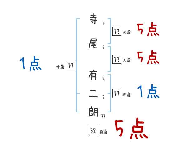 天運![]() | 寺尾有二朗さんの天運は13画の5つ星!才能に恵まれ人気がある。名声を手に入れる。円満な人生。 家系が持つ宿命的な運勢を表します。祖先から受け継いだ苗字ですので自分の力が及びません。家柄を象徴します。 |