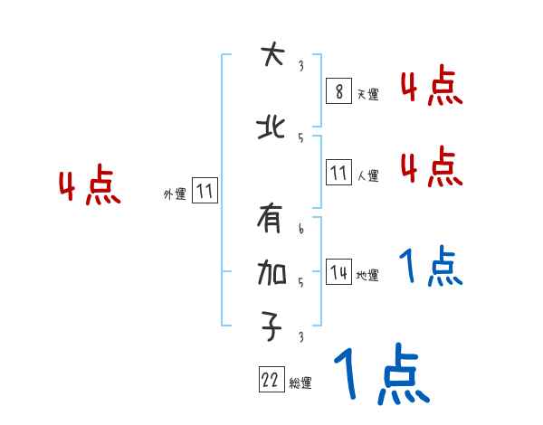 天運![]() | 大北有加子さんの天運は8画の4つ星!勤勉家。根気強く努力し成功する。忍耐力がある。 家系が持つ宿命的な運勢を表します。祖先から受け継いだ苗字ですので自分の力が及びません。家柄を象徴します。 |