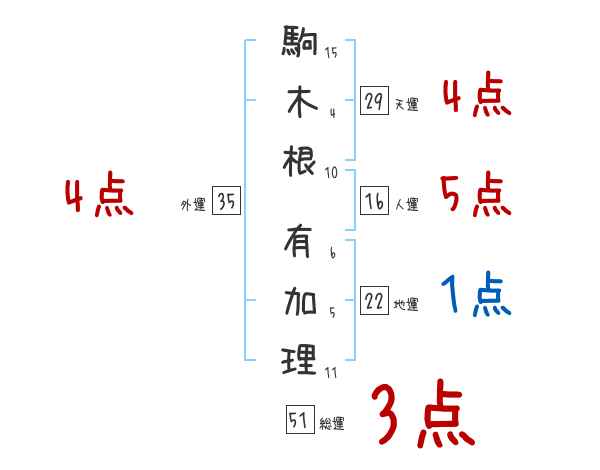 外運![]() | 駒木根有加理さんの外運は35画の4つ星!温厚な性格で感受性が高い。穏和な性格で人望が厚い。 生活面を象徴する運勢です。外部から受ける影響力を表し、結婚運、家庭運や職場、環境への順応性を表します。 |