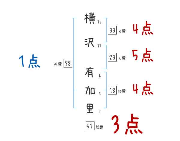 外運![]() | 横沢有加里さんの外運は28画の1つ星!家庭環境に注意。スポーツで活躍できる能力があるかも。 生活面を象徴する運勢です。外部から受ける影響力を表し、結婚運、家庭運や職場、環境への順応性を表します。 |