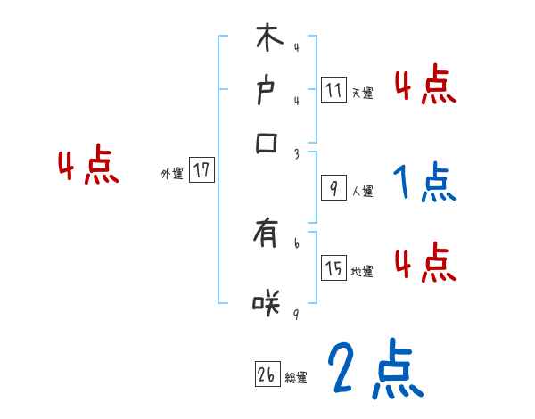 外運![]() | 木戸口有咲さんの外運は17画の4つ星!積極的な行動力。地位を気づき財産を手に入れる。純粋な心と直感力。 生活面を象徴する運勢です。外部から受ける影響力を表し、結婚運、家庭運や職場、環境への順応性を表します。 |