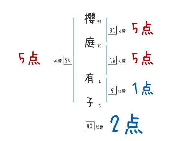 人運![]() | 櫻庭有子さんの人運は16画の5つ星!人望が厚く大きく発展する。逆転成功が見える。 性格や才能などを表す2番目に重要な運勢です。人間関係や協調性、社会的な成功に影響します。主に20歳から50歳ぐらいまでの中年期の運勢を表します。 |