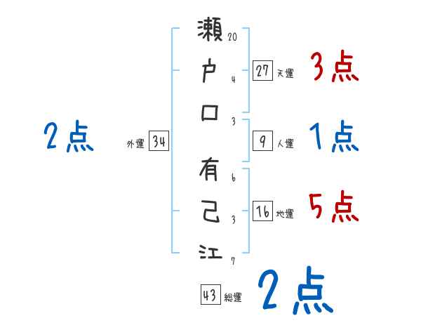 外運![]() | 瀬戸口有己江さんの外運は34画の2つ星!独創性に優れるが、自尊心が強く災難に注意しましょう。 生活面を象徴する運勢です。外部から受ける影響力を表し、結婚運、家庭運や職場、環境への順応性を表します。 |