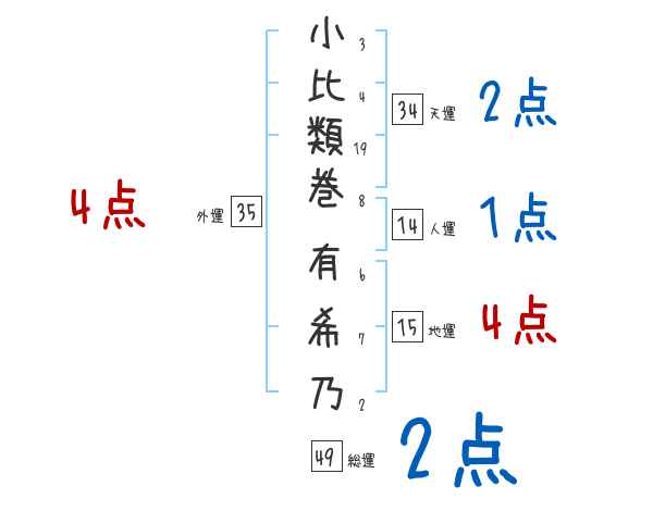 外運![]() | 小比類巻有希乃さんの外運は35画の4つ星!温厚な性格で感受性が高い。穏和な性格で人望が厚い。 生活面を象徴する運勢です。外部から受ける影響力を表し、結婚運、家庭運や職場、環境への順応性を表します。 |