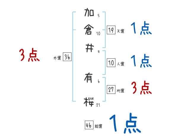 外運![]() | 加倉井有桜さんの外運は36画の3つ星!先見性が豊かです。多少神経質で苦労することも。 生活面を象徴する運勢です。外部から受ける影響力を表し、結婚運、家庭運や職場、環境への順応性を表します。 |