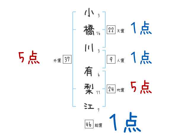 外運![]() | 小橋川有梨江さんの外運は37画の5つ星!努力家で順応性に優れる。現実的な考え方ができ忠実に物事をこなす。 生活面を象徴する運勢です。外部から受ける影響力を表し、結婚運、家庭運や職場、環境への順応性を表します。 |