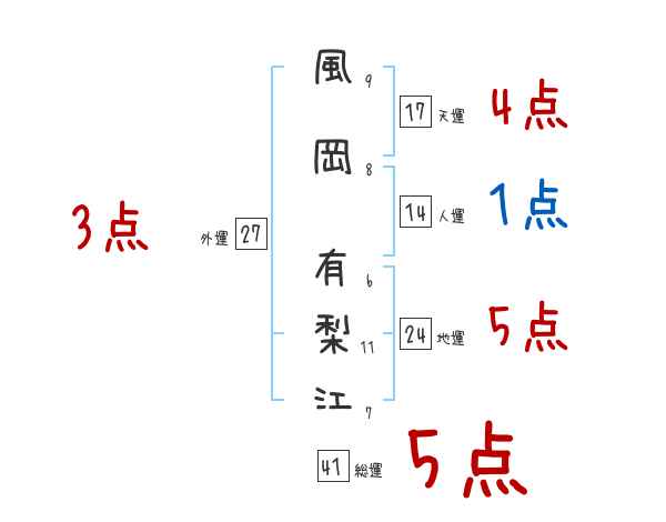 外運![]() | 風岡有梨江さんの外運は27画の3つ星!頭脳明晰だが強情で摩擦が多い傾向。孤立に注意。 生活面を象徴する運勢です。外部から受ける影響力を表し、結婚運、家庭運や職場、環境への順応性を表します。 |