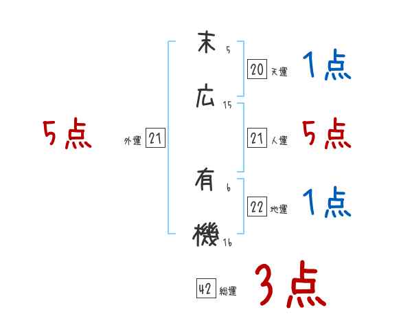 外運![]() | 末広有機さんの外運は21画の5つ星!統率力がある。独立し成功する。名誉を手に入れる。 生活面を象徴する運勢です。外部から受ける影響力を表し、結婚運、家庭運や職場、環境への順応性を表します。 |