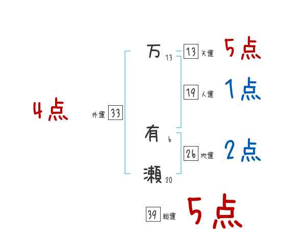 外運![]() | 万有瀬さんの外運は33画の4つ星!権力志向でプライドが高い。勇気があり運を切り開き成功する。 生活面を象徴する運勢です。外部から受ける影響力を表し、結婚運、家庭運や職場、環境への順応性を表します。 |