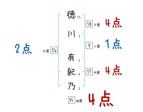 | 天運  | 徳川有紀乃さんの天運は18画の4つ星!情熱的で剛気。忍耐力があり信頼される。家系が持つ宿命的な運勢を表します。祖先から受け継いだ苗字ですので自分の力が及びません。家柄を象徴します。 |