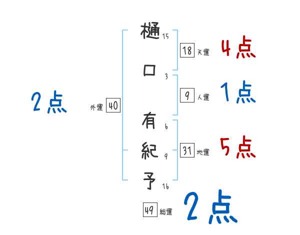 外運![]() | 樋口有紀予さんの外運は40画の2つ星!自信過剰で物事に固執するためトラブルに注意。 生活面を象徴する運勢です。外部から受ける影響力を表し、結婚運、家庭運や職場、環境への順応性を表します。 |