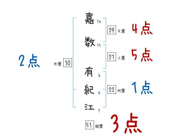 総運![]() | 嘉数有紀江さんの総運は51画の3つ星!変化が激しく、危険に注意。堅実な性格。 あなたの人生を表す1番重要な運勢です。生涯を通じて影響する総合運となり、主に50歳以降の晩年期に影響を及ぼします。 |