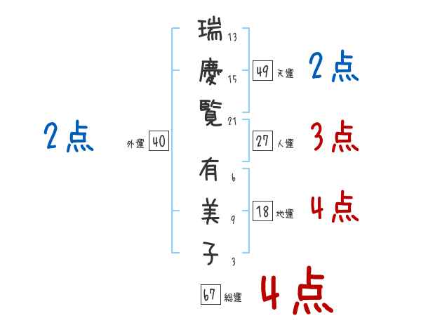 天運![]() | 瑞慶覧有美子さんの天運は49画の2つ星!不安定な性格で明暗がある人生。周りの人には支援されやすい。 家系が持つ宿命的な運勢を表します。祖先から受け継いだ苗字ですので自分の力が及びません。家柄を象徴します。 |