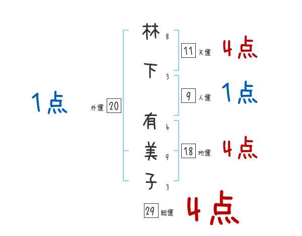 天運![]() | 林下有美子さんの天運は11画の4つ星!着実に富や地位を得る幸運な人生。 家系が持つ宿命的な運勢を表します。祖先から受け継いだ苗字ですので自分の力が及びません。家柄を象徴します。 |