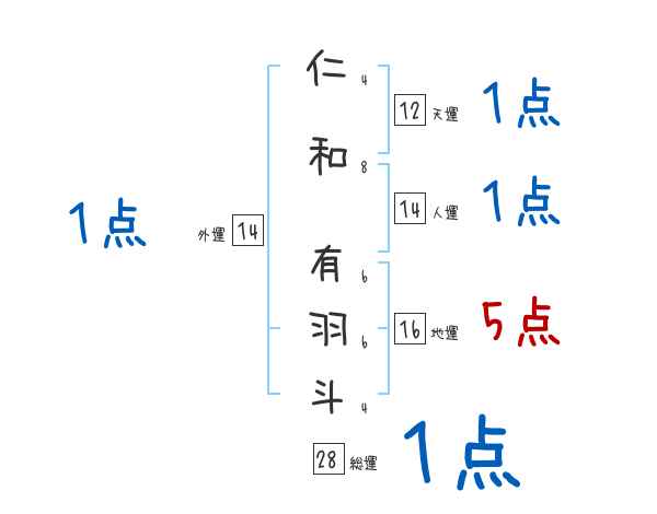 外運![]() | 仁和有羽斗さんの外運は14画の1つ星!人に対して優しいがストレスを溜め込みがち。人間関係のトラブルを避けるよう気をつけましょう。 生活面を象徴する運勢です。外部から受ける影響力を表し、結婚運、家庭運や職場、環境への順応性を表します。 |