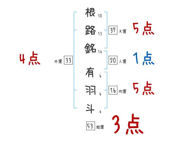 外運![]() | 根路銘有羽斗さんの外運は33画の4つ星!権力志向でプライドが高い。勇気があり運を切り開き成功する。 生活面を象徴する運勢です。外部から受ける影響力を表し、結婚運、家庭運や職場、環境への順応性を表します。 |