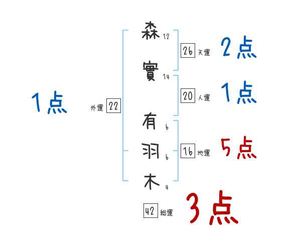 天運![]() | 森實有羽木さんの天運は26画の2つ星!波瀾万丈かも。信頼できる人を大事にしましょう。 家系が持つ宿命的な運勢を表します。祖先から受け継いだ苗字ですので自分の力が及びません。家柄を象徴します。 |