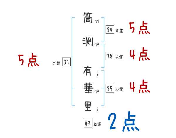 総運![]() | 筒渕有華里さんの総運は49画の2つ星!不安定な性格で明暗がある人生。周りの人には支援されやすい。 あなたの人生を表す1番重要な運勢です。生涯を通じて影響する総合運となり、主に50歳以降の晩年期に影響を及ぼします。 |