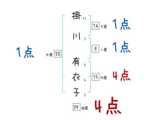 総運![]() | 掛川有衣子さんの総運は29画の4つ星!完全主義で才能がある。厳格な心の持ち主。 あなたの人生を表す1番重要な運勢です。生涯を通じて影響する総合運となり、主に50歳以降の晩年期に影響を及ぼします。 |