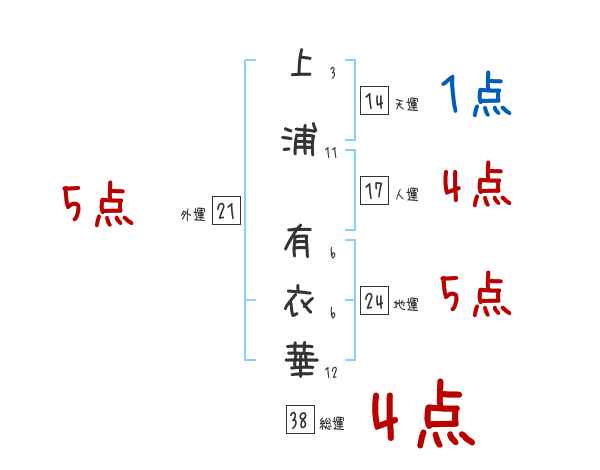 外運![]() | 上浦有衣華さんの外運は21画の5つ星!統率力がある。独立し成功する。名誉を手に入れる。 生活面を象徴する運勢です。外部から受ける影響力を表し、結婚運、家庭運や職場、環境への順応性を表します。 |