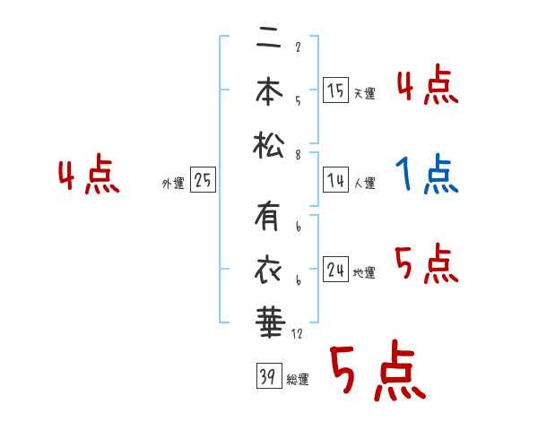 総運![]() | 二本松有衣華さんの総運は39画の5つ星!社交性に優れ人望が厚い。人の上に立ち成功する。 あなたの人生を表す1番重要な運勢です。生涯を通じて影響する総合運となり、主に50歳以降の晩年期に影響を及ぼします。 |