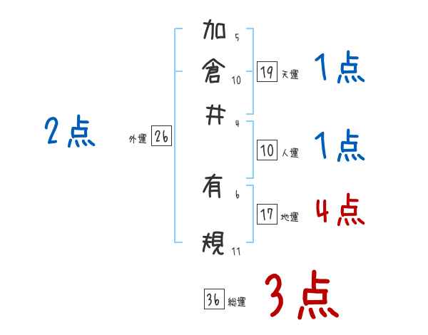 外運![]() | 加倉井有規さんの外運は26画の2つ星!波瀾万丈かも。信頼できる人を大事にしましょう。 生活面を象徴する運勢です。外部から受ける影響力を表し、結婚運、家庭運や職場、環境への順応性を表します。 |