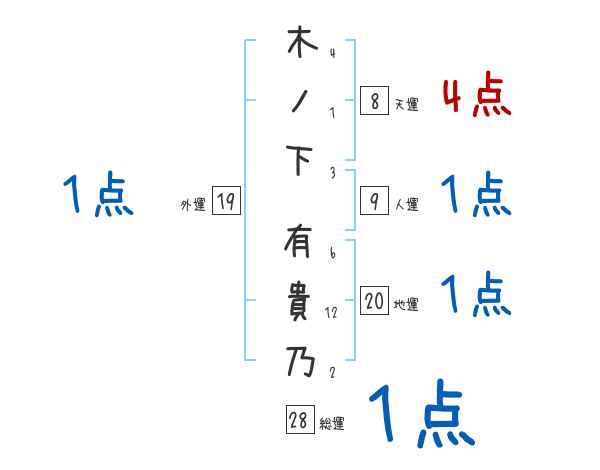 天運![]() | 木ノ下有貴乃さんの天運は8画の4つ星!勤勉家。根気強く努力し成功する。忍耐力がある。 家系が持つ宿命的な運勢を表します。祖先から受け継いだ苗字ですので自分の力が及びません。家柄を象徴します。 |