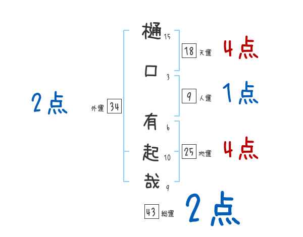 総運![]() | 樋口有起哉さんの総運は43画の2つ星!頑固な性格で独立心が強いかも。やや非現実的で浪費に注意しましょう。 あなたの人生を表す1番重要な運勢です。生涯を通じて影響する総合運となり、主に50歳以降の晩年期に影響を及ぼします。 |